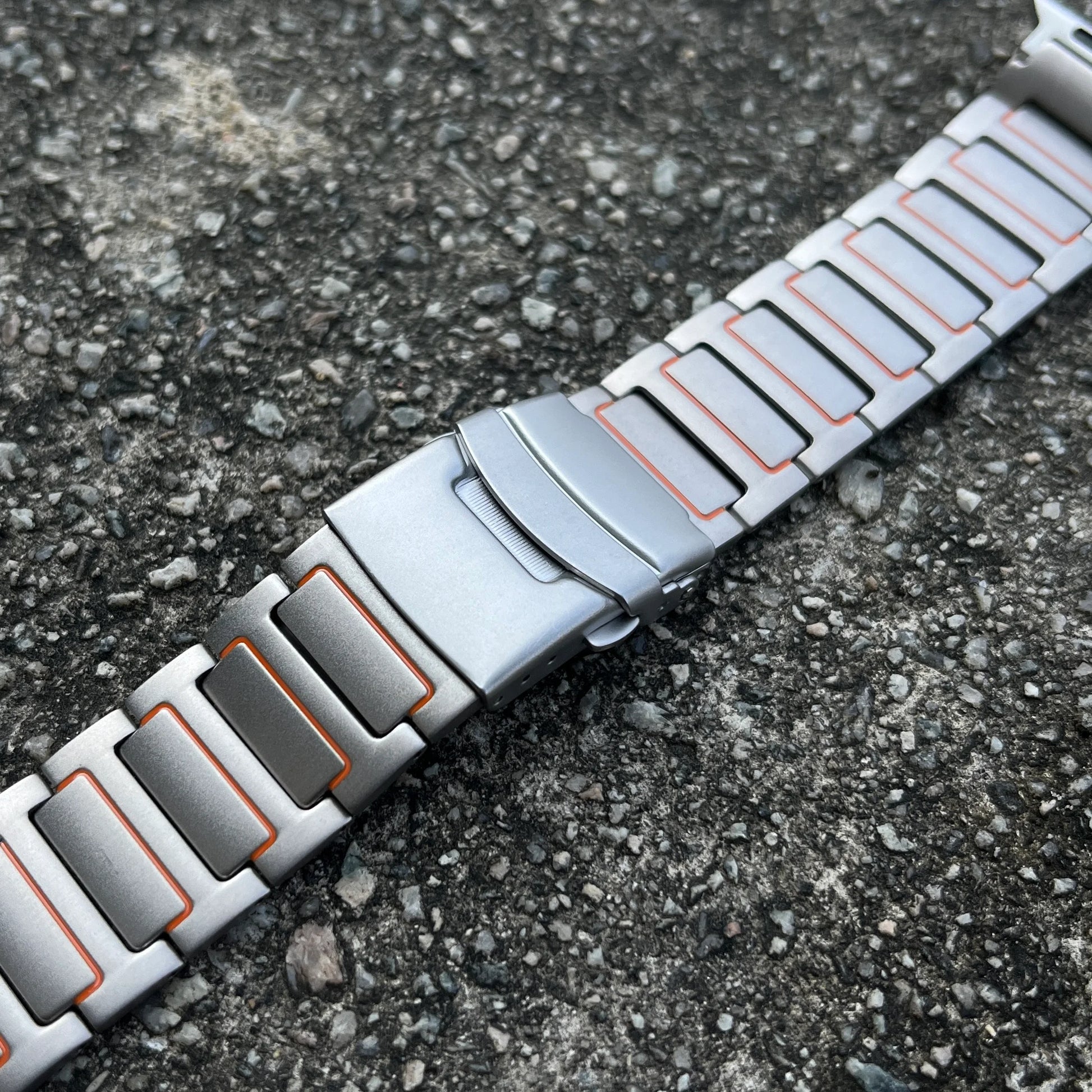 Despite its bold and premium appearance, this bracelet is designed for all-day comfort. Smooth, rounded edges prevent irritation, while the flexible link structure adapts naturally to your wrist, making it perfect for office wear, events, and everyday use. Subtle orange accents integrated between the links add a modern, distinctive touch, elevating its style even further.